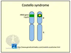 Costello syndrome, also called faciocutaneoskeletal syndrome or FCS syndrome, is a rare genetic disorder that affects many parts of the body. It is characterized by delayed development and intellectual disabilities, distinctive facial features, unusually flexible joints, and loose folds of extra skin, especially on the hands and feet.[1] Heart abnormalities are common, including a very fast heartbeat (tachycardia), structural heart defects, and overgrowth of the heart muscle (hypertrophic cardiomyopathy). Infants with Costello syndrome may be large at birth, but grow more slowly than other children and have difficulty feeding. Later in life, people with this condition have relatively short stature and many have reduced levels of growth hormones. It is a RASopathy.