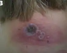 Cowpox is an infection caused by the cowpox virus (CPXV).[3] It presents with large fluid filled bumps in the skin, a fever and swollen glands, typically following contact with an infected cow.[2] The hands and face are most frequently affected and the spots are generally very painful.[4]