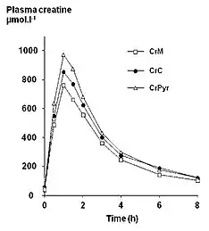 - ↑ Jäger R, Harris RC, Purpura M, Francaux M (November 2007). "Comparison of new forms of creatine in raising plasma creatine levels". Journal of the International Society of Sports Nutrition. 4: 17. doi:10.1186/1550-2783-4-17. PMC 2206055. PMID 17997838.