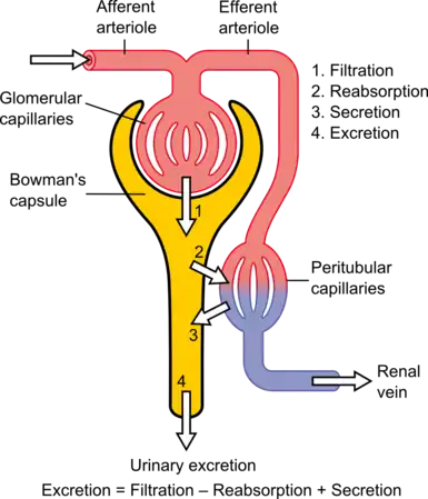 The glomerular filtration rate (GFR) describes the volume of fluid filtered from the renal (kidney) glomerular capillaries into the Bowman's capsule per unit time.[3] Creatinine clearance is the volume of blood plasma that is cleared of creatinine per unit time and is a useful measure for approximating the GFR. Creatinine clearance exceeds GFR due to creatinine secretion,[4] which can be blocked by cimetidine. Both GFR and CCr may be accurately calculated by comparative measurements of substances in the blood and urine, or estimated by formulas using just a blood test result (eGFR and eCCr) The results of these tests are used to assess the excretory function of the kidneys. Staging of chronic kidney disease is based on categories of GFR as well as albuminuria and cause of kidney disease.[2]