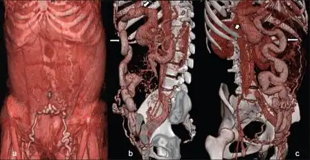 | a) Caput medusae b,c) paraumbilical vein being fed by left branch of portal vein | |