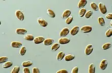 The cryptophyceae are a class of algae,[1] most of which have plastids. About 230 species are known,[2] and they are common in freshwater, and also occur in marine and brackish habitats. Each cell is around 10–50 μm in size and flattened in shape, with an anterior groove or pocket. At the edge of the pocket there are typically two slightly unequal flagella.