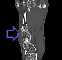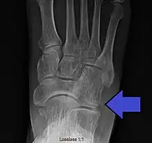 A cuboid fracture is a fracture of the cuboid bone of the foot. Diagnosis is by X-ray imaging, magnetic resonance imaging, or bone scan.[1] Treatment may be conservative or involve surgery, depending on the type of fracture.[1] They are rare.[1]