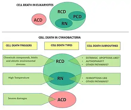 One of the most critical processes determining cyanobacterial eco-physiology is cellular death. Evidence supports the existence of controlled cellular demise in cyanobacteria, and various forms of cell death have been described as a response to biotic and abiotic stresses. However, cell death research in cyanobacteria is a relatively young field and understanding of the underlying mechanisms and molecular machinery underpinning this fundamental process remains largely elusive.[25] However, reports on cell death of marine and freshwater cyanobacteria indicate this process has major implications for the ecology of microbial communities/[137][138][139][140] Different forms of cell demise have been observed in cyanobacteria under several stressful conditions,[141][142] and cell death has been suggested to play a key role in developmental processes, such as akinete and heterocyst differentiation, as well as strategy for population survival.[136][143][144][48][25]