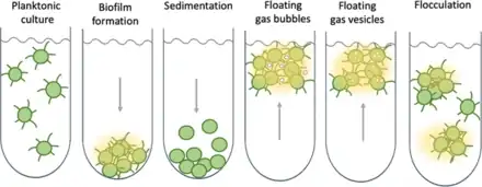 As shown in the diagram on the right, bacteria can stay in suspension as individual cells, adhere collectively to surfaces to form biofilms, passively sediment, or flocculate to form suspended aggregates. Cyanobacteria are able to produce sulphated polysaccharides (yellow haze surrounding clumps of cells) that enable them to form floating aggregates. In 2021, Maeda et al. discovered that oxygen produced by cyanobacteria becomes trapped in the network of polysaccharides and cells, enabling the microorganisms to form buoyant blooms.[125] It is thought that specific protein fibres known as pili (represented as lines radiating from the cells) may act as an additional way to link cells to each other or onto surfaces. Some cyanobacteria also use sophisticated intracellular gas vesicles as floatation aids.[123]