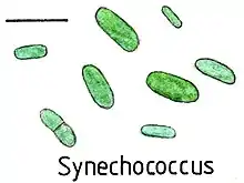 Marine cyanobacteria include the smallest known photosynthetic organisms. The smallest of all, Prochlorococcus, is just 0.5 to 0.8 micrometres across.[44] In terms of numbers of individuals, Prochlorococcus is possibly the most plentiful genus on Earth: a single millilitre of surface seawater can contain 100,000 cells of this genus or more. Worldwide there are estimated to be several octillion (1027, a billion billion billion) individuals.[45] Prochlorococcus is ubiquitous between latitudes 40°N and 40°S, and dominates in the oligotrophic (nutrient-poor) regions of the oceans.[46] The bacterium accounts for about 20% of the oxygen in the Earth's atmosphere.[47]