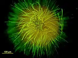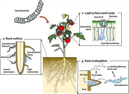 Some cyanobacteria, the so-called cyanobionts (cyanobacterial symbionts), have a symbiotic relationship with other organisms, both unicellular and multicellular.[102] As illustrated on the right, there are many examples of cyanobacteria interacting symbiotically with land plants.[103][104][105][106] Cyanobacteria can enter the plant through the stomata and colonize the intercellular space, forming loops and intracellular coils.[107] Anabaena spp. colonize the roots of wheat and cotton plants.[108][109][110] Calothrix sp. has also been found on the root system of wheat.[109][110] Monocots, such as wheat and rice, have been colonised by Nostoc spp.,[111][112][113][114] In 1991, Ganther and others isolated diverse heterocystous nitrogen-fixing cyanobacteria, including Nostoc, Anabaena and Cylindrospermum, from plant root and soil. Assessment of wheat seedling roots revealed two types of association patterns: loose colonization of root hair by Anabaena and tight colonization of the root surface within a restricted zone by Nostoc.[111][101]