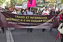 Intersex banner at a trans march reading: "Trans and intersex, migrants in social danger: expulsions, impoverishment, contamination, and violence." Existrans 2017, Paris.