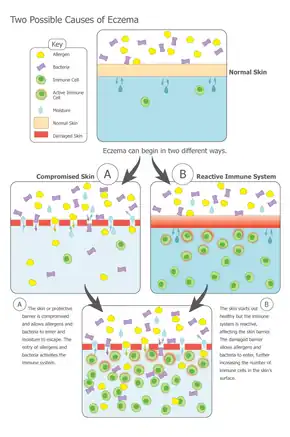 - ↑ Allam JP, Novak N (January 2006). "The pathophysiology of atopic eczema". Clinical and Experimental Dermatology. 31 (1): 89–93. doi:10.1111/j.1365-2230.2005.01980.x. PMID 16309494.