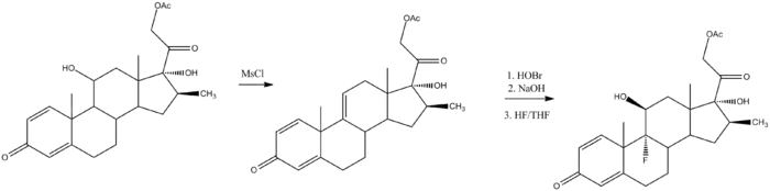 To synthesize dexamethasone, 16β-methylprednisolone acetate is dehydrated to the 9,11-dehydro derivative.[53][54] This is then reacted with a source of hypobromite, such as basic N-bromosuccinimide, to form the 9α-bromo-11β-hydrin derivative, which is then ring-closed to an epoxide. A ring-opening reaction with hydrogen fluoride in tetrahydrofuran gives dexamethasone.