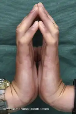Diabetic cheiroarthropathy, also known as Diabetic stiff hand syndrome or limited joint mobility syndrome, is a cutaneous condition characterized by waxy, thickened skin and limited joint mobility of the hands and fingers, leading to flexion contractures, a condition associated with diabetes mellitus[1]: 681 and it is observed in roughly 30% of diabetic patients with longstanding disease.[2]: 540 [3]