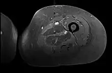 Axial fat suppressed T2 weighted MRI image showing hyperintense signal and enlargement of the left thigh adductor muscle group in diabetic myonecrosis.