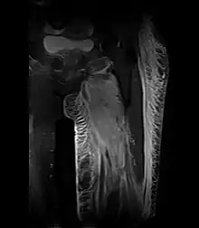 Coronal fat suppressed STIR image demonstrating enlargement and increased signal in the left adductor muscle group with associated subcutaneous edema in a patient with diabetic myonecrosis.