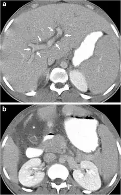 Axial contrast-enhanced CT images demonstrate the presence of intra-abdominal free fluid asterisk and periportal edema arrows