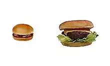 A comparison of a typical 1984 cheeseburger (left) of 333 calories with a 2004 cheeseburger (right) of 590 calories as per the National Heart, Lung, and Blood Institute[11]
