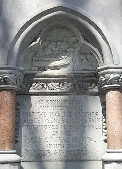 William T. G. Morton participated in a public demonstration of ether anesthesia on October 16, 1846, at the Ether Dome in Boston, Massachusetts. Morton had called his ether preparation, with aromatic oils to conceal its smell, "Letheon" after the Lethe River (Λήθη, meaning "forgetfulness, oblivion"). [14] However, Crawford Williamson Long is now known to have demonstrated its use privately as a general anesthetic in surgery to officials in Georgia, as early as March 30, 1842, and Long publicly demonstrated ether's use as a surgical anesthetic on six occasions before the Boston demonstration.[15][16][17] British doctors were aware of the anesthetic properties of ether as early as 1840 where it was widely prescribed in conjunction with opium.[18] Diethyl ether largely supplanted the use of chloroform as a general anesthetic due to ether's more favorable therapeutic index, that is, a greater difference between an effective dose and a potentially toxic dose.[19]