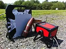 EOD (Explosive Ordnance Disposal) training and material testing. A 105 mm shell is radiographied with battery powered portable X-ray generator and flat panel detector.