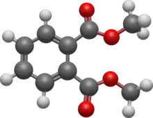It is used in a variety of products and is most commonly used as insect repellent such as ectoparasiticide for mosquitoes and flies for animal livestock.[4] The short-chain or low molecular weight phthalate is also frequently used in consumer products such as cosmetics, ink, soap, household cleaning supplies, etc.[5] Other uses of DMP include solid rocket propellants (as a stabilizer) and plastics.[4][5]