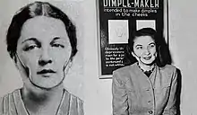 Women without dimples are said to envy the women that have them because dimples are "pitfalls for the men" that "[are] something purely natural and unattainable by art".[35] While it is not possible to give a definite explanation as to why dimples are attractive on a woman, researchers believe this "neutral feature" can be linked to paternity confidence, which is the ability of a man to easily distinguish his own offspring.[37] This has led to artificial attempts to create them: the Ohio-based Dolly Dimpler company advertized in Photoplay about a device that created dimples in customers' cheeks;[38] in 1936, Isabella Gilbert invented the Dimple Maker, a face-fitting brace which pushed dents into the cheeks to emulate dimples,[39] but it is unknown whether the artificial dimples could last this way (the American Medical Association argued that frequent users could develop cancer);[40] and in the 21st century, people undergo dimple surgery.[41]