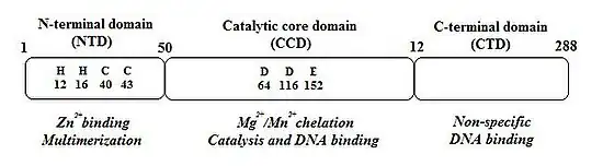 2. The catalytic core domain (CCD), which encompasses amino acids 51- 212, contains the active site of IN but it can't catalyze integration in the absence of NTD and CTD (the C-terminal domain).[11] CCD contains three absolutely conserved negatively charged amino acids; D64, D116 and E152.[9] These amino acids form the DDE motif that coordinate divalent metal ions (Mg2+ or Mn2+). These metal ions are essential for the catalysis of integration.[12][13] CCD has a mixed β and α structure with five β-sheets and six α helices that are linked by flexible loops.[12] The flexible loops allow conformational changes that are required for 3´processing of the viral DNA and strand transfer (STF) reactions which are two key steps of the integration reaction.[9] CCD is essential for these steps and substitution of any of the residues in the DDE motif dramatically inhibits the activity of IN.[12]