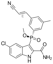 Fosdevirine (also known as IDX899 and GSK-2248761) is another next generation NNRTI developed by Idenix Pharmaceuticals and ViiV Healthcare. It belongs to the family of 3-phosphoindoles. In vitro studies have shown comparable resistance profile to that of the other next generation NNRTIs.[7] In November 2009 the candidate entered phase II clinical trials, but the trial and all further development was halted when 5 of 35 subjects receiving fosdevirine experienced delayed-onset seizures.[28]