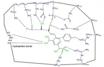 Studies have shown that statins bind reversibly to the HGMR enzyme. The affinity of statins for HGMR enzyme is in the nanomolar range, while the natural substrate's affinity is in the micromolar range.[10] Studies have shown that statins use the conformational flexibility of the HMGR enzyme that causes a shallow hydrophobic groove that the statins exploit and is used to accommodate their hydrophobic moieties.[11] The specificity and the tight binding of statins is due to orientation and bonding interactions that form between the statin and the HMGR enzyme.[9] Polar interactions are formed between the HMG-moiety and residues that are located in the cis loop of the enzyme. These polar interactions are between Ser684, Asp690, Lys691 and Lys692 (Figure 4). The terminal carboxylate of the HMG moiety forms a salt bridge with the cationic Lys735 of the enzyme. In addition to the polar interaction, Lys691 participates in a hydrogen bonding network with Glu559, Asp767 and the O5 hydroxyl group of the hydroxyglutartic acid component of the statins. Van der Waals interactions are formed between the hydrophobic side chains of the enzyme, which involve the Leu562, Val683, Leu853, Ala856 and Leu857 and the statins.[9] Type 2 statins form polar interaction between the fluorine atom on the fluorophenyl group and the guanidinium group of Arg590.[11] In addition to these interactions atorvastatin and rosuvastatin also form unique hydrogen bonds between Ser565 residue and either a carbonyl oxygen atom (atorvastatin) or a sulfone oxygen atom (rosuvastatin). A unique polar interaction between the Arg568 side chain and the electronegative sulfone group on rosuvastatin makes it the statin that has the greatest number of bonding interactions with HGMR.[9]