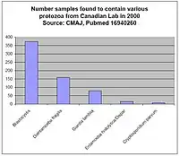 Figure 1 shows the prevalence of gastrointestinal protozoa in studies from the United States and Canada.[45][44] The most prevalent protozoa in these studies are considered emerging infectious diseases by some researchers, because a consensus does not yet exist in the medical and public health spheres concerning their importance in the role of human disease.[47][48] Researchers have suggested that their treatment may be complicated by differing opinions regarding pathogenicity, lack of reliable testing procedures, and lack of reliable treatments.[49] As with newly discovered pathogens before them, researchers are reporting that these organisms may be responsible for illnesses for which no clear cause has been found, such as irritable bowel syndrome.[50][51][52]