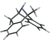 As an antidepressant, positive results were found in animal models of depression.[24] NMDA antagonists like dizocilpine have been shown in animal models to attenuate the hearing loss caused by aminoglycosides It is thought that aminoglycosides mimic endogenous polyamines at NMDA receptors and produce excitotoxic damage, leading to hair cell loss. Antagonizing NMDA receptors to reduce the excitotoxicity would prevent that hearing loss.[25][26] Dizocilpine was found to block the development of kindled seizures, although it does not have any effect on completed kindled seizures.[27] Oddly, it was discovered to decrease rabies virus production and is believed to be the first neurotransmitter antagonist to present with antiviral activity. Rat cortical neuron cells were infected with the rabies virus and those incubated with dizocilpine had virus produced reduced about 1000-fold. It is not known how MK-801 has this effect; the rabies virus suspension, without cells, was inoculated with dizocilpine and the drug failed to produce a virucidal effect, indicated that the mechanism of action is something other than direct discontinuation of virus reproduction. It was also tested against herpes simplex, vesicular stomatitis, poliovirus type I, and HIV. It did not have activity against these other viruses, however.[28] Dizocilpine was also shown to potentiate the ability of levodopa to ameliorate akinesia and muscular rigidity in a rodent model of parkinsonism.[29] When dizocilpine was administered to rats 15 minutes after a spinal trauma, the long-term neurological recovery of the trauma was improved.[30] However, NMDA antagonists like dizocilpine have largely failed to show safety in clinical trials, possibly due to inhibition of NMDA receptor function that is necessary for normal neuronal function. Since dizocilpine is a particularly strong NMDA receptor antagonist, this drug is particularly likely to have psychotomimetic side effects (such as hallucinations) that result from NMDA receptor blockade. Dizocilpine had a promising future as a neuroprotective agent until neurotoxic-like effects, called Olney's Lesions, were seen in certain brain regions of lab rats.[31][32] Merck, a drug company, promptly dropped development of dizocilpine.