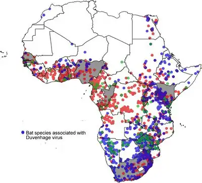 Duvenhage lyssavirus (DUVV) is a member of the genus Lyssavirus, which also contains the rabies virus. The virus was discovered in 1970, when a South African farmer (after whom the virus is named) died of a rabies-like encephalitic illness, after being bitten by a bat.[2] In 2006, Duvenhage virus killed a second person, when a man was scratched by a bat in North West Province, South Africa, 80 km from the 1970 infection.[3] He developed a rabies-like illness 27 days after the bat encounter, and died 14 days after the onset of illness. A 34-year-old woman who died in Amsterdam on December 8, 2007, was the third recorded fatality. She had been scratched on the nose by a small bat while travelling through Kenya in October 2007, and was admitted to hospital four weeks later with rabies-like symptoms.[4]