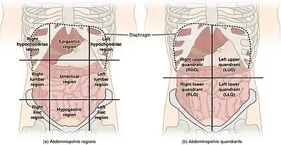 - Either in the epigastric region (the center of the abdomen above the navel, or belly-button)