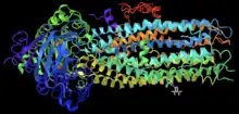 Ivacaftor is a selective small-molecule potentiator of the CFTR protein that increases the protein's ability to open chloride channels.[21][22] Its effectiveness is highly dependent on the amount of CFTR protein at the cell surface and the responsiveness of the mutant CFTR protein.[23] Ivacaftor's primary target is to treat class III CFTR gating mutations like G551D as well as other less common mutations.[22] In the crystalline figure is shown ivacaftor, displayed as a gray ball and stick model on the bottom-right, bound to CFTR docked in a cleft formed by transmembrane helices at the protein-lipid interface.[24]