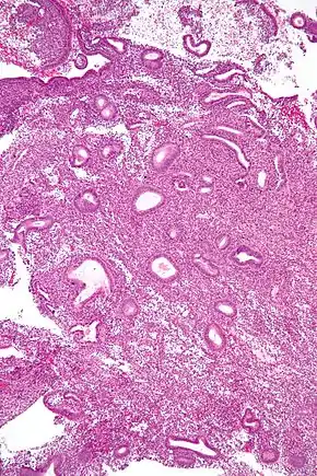 ![]() Micrograph showing an endometrial biopsy with simple endometrial hyperplasia, where the gland-to-stroma ratio is preserved but the glands have an irregular shape and/or are dilated. H&E stain. | |