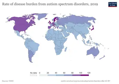 - ↑ Elsabbagh M, Divan G, Koh YJ, Kim YS, Kauchali S, Marcín C, et al. (June 2012). "Global prevalence of autism and other pervasive developmental disorders". Autism Research. 5 (3): 160–79. doi:10.1002/aur.239. PMC 3763210. PMID 22495912.