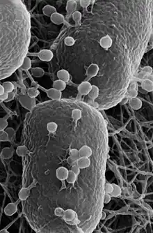 - ↑ Leppänen M, Sundberg LR, Laanto E, de Freitas Almeida GM, Papponen P, Maasilta IJ (August 2017). "Imaging Bacterial Colonies and Phage-Bacterium Interaction at Sub-Nanometer Resolution Using Helium-Ion Microscopy". Advanced Biosystems. 1 (8): e1700070. doi:10.1002/adbi.201700070. PMID 32646179. S2CID 90960276.