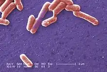 Escherichia coli (/ˌɛʃəˈrɪkiə ˈkoʊlaɪ/ ESH-ə-RIK-ee-ə KOH-ly)[1][2] is a gram-negative, facultative anaerobic, rod-shaped, coliform bacterium of the genus Escherichia that is commonly found in the lower intestine of warm-blooded organisms.[3][4] Most E. coli strains are harmless, but some serotypes such as EPEC, and ETEC are pathogenic and can cause serious food poisoning in their hosts, and are occasionally responsible for food contamination incidents that prompt product recalls.[5][6] Most strains are part of the normal microbiota of the gut and are harmless or even beneficial to humans (although these strains tend to be less studied than the pathogenic ones).[7] For example, some strains of E. coli benefit their hosts by producing vitamin K2[8] or by preventing the colonization of the intestine by pathogenic bacteria. These mutually beneficial relationships between E. coli and humans are a type of mutualistic biological relationship — where both the humans and the E. coli are benefitting each other.[9][10] E. coli is expelled into the environment within fecal matter. The bacterium grows massively in fresh fecal matter under aerobic conditions for three days, but its numbers decline slowly afterwards.[11]
