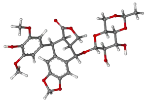 Etoposide is a semisynthetic derivative of podophyllotoxin from the rhizome of the wild mandrake (Podophyllum peltatum). More specifically, it is a glycoside of podophyllotoxin with a D-glucose derivative. It is chemically similar to the anti-cancer drug teniposide, being distinguished only by a methyl group where teniposide has a thienyl.[12] Both these compounds have been developed with the aim of creating less toxic derivatives of podophyllotoxin.[13]