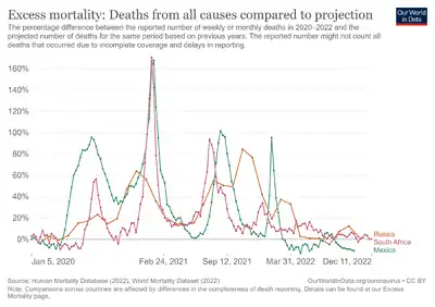 1. Islam, Nazrul; Shkolnikov, Vladimir M; Acosta, Rolando J; Klimkin, Ilya; Kawachi, Ichiro; Irizarry, Rafael A; Alicandro, Gianfranco; Khunti, Kamlesh; Yates, Tom; Jdanov, Dmitri A; White, Martin (2021). "Excess deaths associated with covid-19 pandemic in 2020: age and sex disaggregated time series analysis in 29 high income countries". BMJ. 373: n1137. doi:10.1136/bmj.n1137. ISSN 1756-1833. PMC 8132017. PMID 34011491.