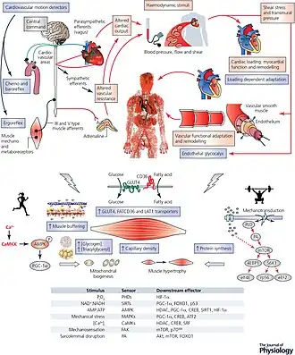 Aerobic exercise induces mitochondrial biogenesis and an increased capacity for oxidative phosphorylation in the mitochondria of skeletal muscle, which is one mechanism by which aerobic exercise enhances submaximal endurance performance.[95][89][96] These effects occur via an exercise-induced increase in the intracellular AMP:ATP ratio, thereby triggering the activation of AMP-activated protein kinase (AMPK) which subsequently phosphorylates peroxisome proliferator-activated receptor gamma coactivator-1α (PGC-1α), the master regulator of mitochondrial biogenesis.[89][96][97]
