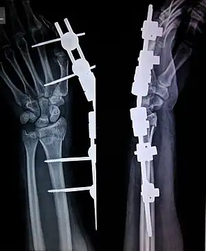 External fixation is a surgical treatment wherein Kirschner pins and wires are inserted and affixed into bone and then exit the body to be attached to an external apparatus composed of rings and threaded rods — the Ilizarov apparatus, the Taylor Spatial Frame, and the Octopod External Fixator — which immobilises the damaged limb to facilitate healing.[1] As an alternative to internal fixation, wherein bone-stabilising mechanical components are surgically emplaced in the body of the patient, external fixation is used to stabilize bone tissues and soft tissues at a distance from the site of the injury.