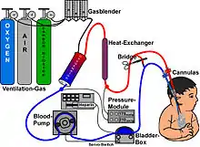 Extracorporeal membrane oxygenation (ECMO), is a form of extracorporeal life support, providing prolonged cardiac and respiratory support to persons whose heart and lungs are unable to provide an adequate amount of oxygen, gas exchange or blood supply (perfusion) to sustain life. The technology for ECMO is largely derived from cardiopulmonary bypass, which provides shorter-term support with arrested native circulation. The device used is a membrane oxygenator, also known as an artificial lung.