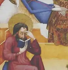 Seated apostle holding lenses in position for reading. Detail from Death of the Virgin, by the Master of Heiligenkreuz, c.1400–1430 (Getty Center).