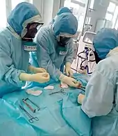 Surgeons wearing full-facepiece elastomeric respirators while doing tracheostomy to a COVID-19 patient in Russia