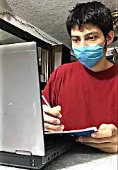 Student in Mexico wearing a surgical mask while taking classes at home in the early beginnings of the pandemic in April 2020 when the risks of contagion were not well known yet