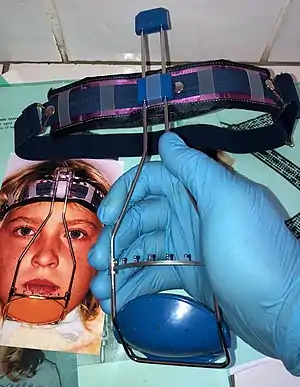 A facemask (also referred to as a protraction facemask, orthopedic facemask, or reverse-pull headgear) is a type of an orthodontic headgear used to treat underbite and other malocclusions where the upper jaw is too far backwards.[1] A metal bar sits in front of the patients face with support from the forehead and chin. Elastics are connected to the metal bar and the teeth - directly through the lips / mouth of the patient. The elastics apply forward and downward pressure on the upper jaw. Thus the force direction is the opposite from a standard headgear which is why this appliance is also known as a reverse-pull-headgear. [1]