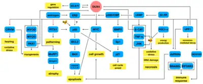 It remains an area of active research how DUX4 protein causes muscle damage.[64] DUX4 protein is a transcription factor that regulates many other genes. Some of these genes are involved in apoptosis, such as p53, p21, MYC, and β-catenin, and indeed it seems that DUX4 protein makes muscle cells more prone to apoptosis. Other DUX4 protein-regulated genes are involved in oxidative stress, and indeed it seems that DUX4 expression lowers muscle cell tolerance of oxidative stress. Variation in the ability of individual muscles to handle oxidative stress could partially explain the muscle involvement patterns of FSHD. DUX4 protein downregulates many genes involved in muscle development, including MyoD, myogenin, desmin, and PAX7, and indeed DUX4 expression has shown to reduce muscle cell proliferation, differentiation, and fusion. DUX4 protein regulates a few genes that are involved in RNA quality control, and indeed DUX4 expression has been shown to cause accumulation of RNA with subsequent apoptosis.[62] Estrogen seems to play a role in modifying DUX4 protein effects on muscle differentiation, which could explain why females are lesser affected than males.
