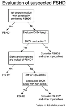 Genetic testing is the gold standard for FSHD diagnosis, as it is the most sensitive and specific test available.[2] Commonly, FSHD1 is tested for first.[2] A shortened D4Z4 array length (EcoRI length of 10 kb to 38 kb) with an adjacent 4qA allele supports FSHD1.[2] If FSHD1 is not present, commonly FSHD2 is tested for next by assessing methylation at 4q35.[2] Low methylation (less than 20%) in the context of a 4qA allele is sufficient for diagnosis.[2] The specific mutation, usually one of various SMCHD1 mutations, can be identified with next-generation sequencing (NGS).[72]