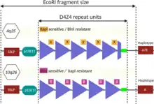 Restriction fragment length polymorphism (RFLP) analysis was the first genetic test developed and is still used as of 2020, although it is being phased out by newer methods. It involves dicing the DNA with restriction enzymes and sorting the resulting restriction fragments by size using southern blot. The restriction enzymes EcoRI and BlnI are commonly used. EcoRI isolates the 4q and 10q repeat arrays, and BlnI dices the 10q sequence into small pieces, allowing 4q to be distinguished.[3][42] The EcoRI restriction fragment is composed of three parts: 1) 5.7 kb proximal part, 2) the central, variable size D4Z4 repeat array, and 3) the distal part, usually 1.25 kb.[77] The proximal portion has a sequence of DNA stainable by the probe p13E-11, which is commonly used to visualize the EcoRI fragment during southern blot.[42] The name "p13E-11" reflects that it is a subclone of a DNA sequence designated as cosmid 13E during the human genome project.[78][79] Considering that each D4Z4 repeat is 3.3 kb, and the EcoRI fragment contains 6.9 kb of DNA that is not part of the D4Z4 repeat array, the number of D4Z4 units can be calculated.