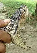 A fang is a long, pointed tooth.[1] In mammals, a fang is a modified maxillary tooth, used for biting and tearing flesh. In snakes, it is a specialized tooth that is associated with a venom gland (see snake venom).[2] Spiders also have external fangs, which are part of the chelicerae.