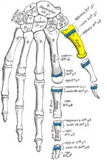 Dorsal view of the left hand (first metacarpal shown in yellow).
