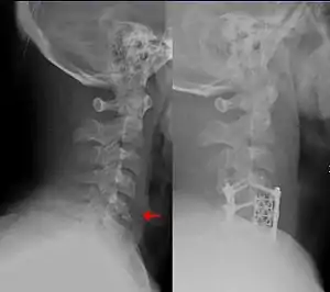 | Teardrop fracture of the cervical spine before and after treatment with metal fixation | |